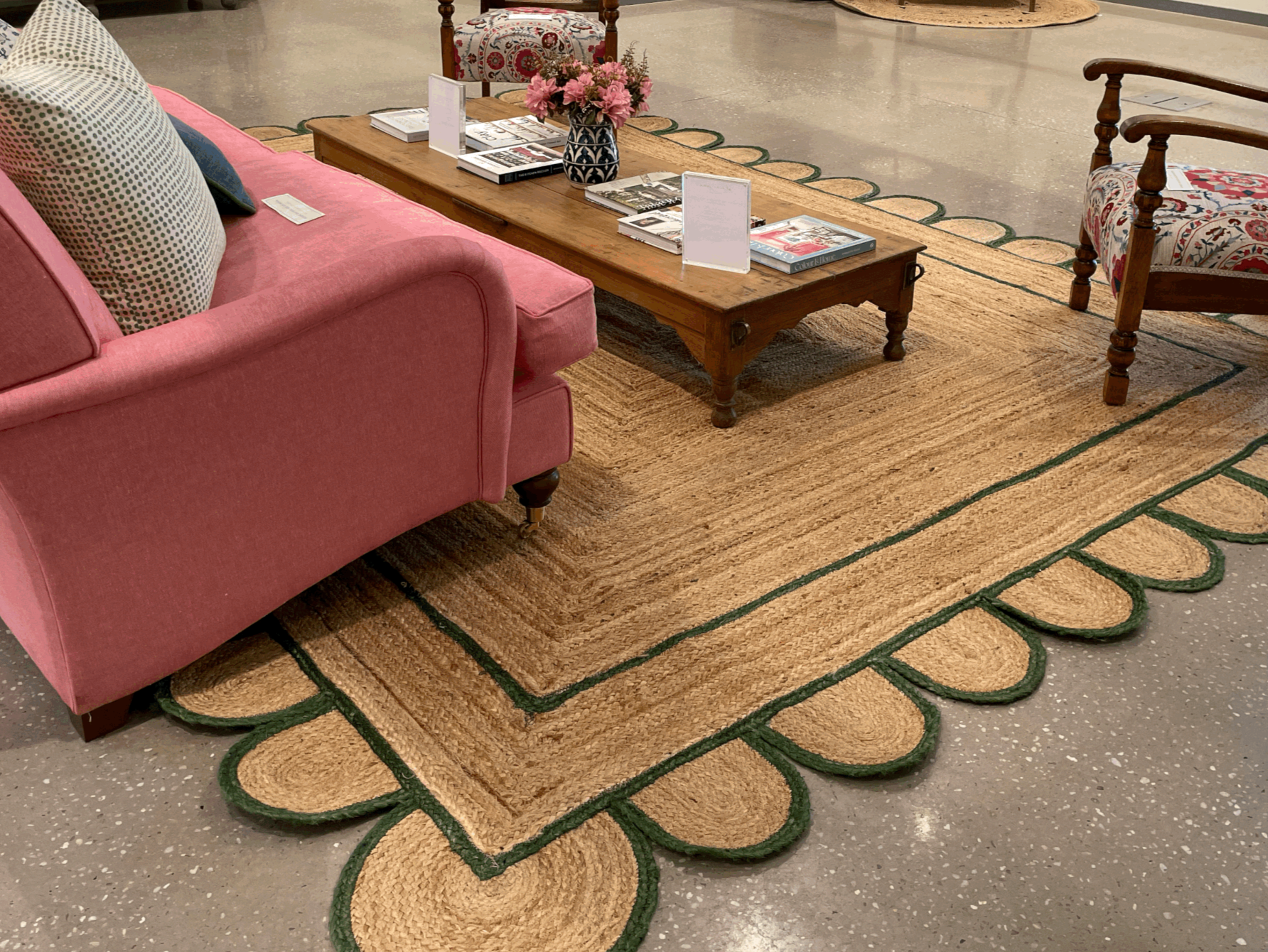 Our most popular rugs! These gorgeous jute rugs are handmade in Jaipur, India. They are hand woven and stitched to ensure extra toughness, finished with a scallop detail and coloured trim.